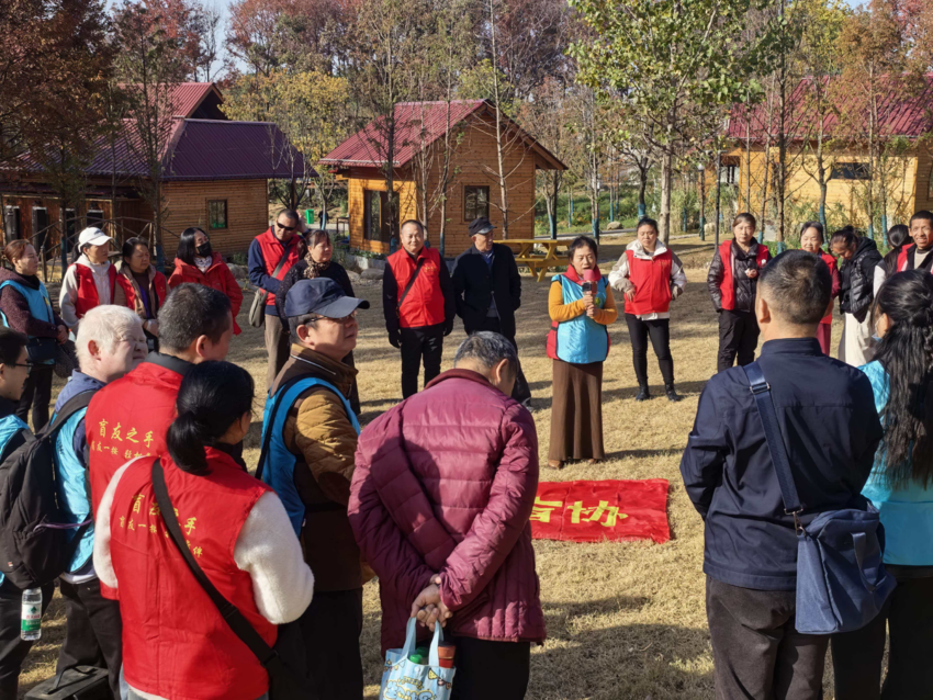 在户外拓展区域,大家围在一起交流生活感悟。部分视障朋友分享了自己在康复、就业中的经历,讲述着在家人、社会关爱下积极生活的故事。现场氛围温馨而热烈,没有距离感,只有心与心的贴近。