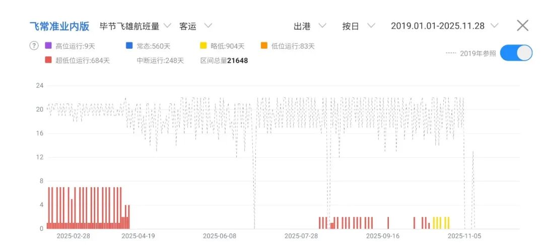 ▲毕节飞雄机场冬春航季已无航班运行,与2019年参考值差距明显在全国范围内,高铁对于支线机场的客流冲击也有诸多先例——以2019年与2024年的运输机场生产统计公报数据作为对比,筛选期间开通高铁或动车的城市后发现,梅州梅县机场受高铁开通影响最为严重,客流跌幅高达87.4%;毕节飞雄机场、九寨黄龙机场、普洱思茅机场、攀枝花保安营机场、六盘水月照机场等的客流跌幅均超过70%;而遵义新舟机场、毕节飞雄机场、保山云瑞机场等则成为客流流失总量最多的机场,累计流失量均超80万人次。此外,随着沈白高速铁路的开通,白山长白山机场的客流也预计面临新的冲击。