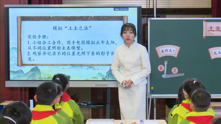 李老师以“土圭之法的故事”为主线,围绕“是什么”“怎么做”“为什么”三大探究主题,构建了一节融合数学、历史、科学、语文等多学科的综合实践课。开篇以《尚书·尧典》等典籍引导学生溯源“土圭之法”,激发学生求知欲和探究欲;随后通过VR历史展厅、手电筒模拟实验、视频科普、本地日影测算等实践活动,层层推进地引导学生对圭表结构、测影原理及其与二十四节气、农耕文明关系的理解,将抽象的数学度量知识与古代历法智慧、农事生活自然衔接,既落实了课程标准中对中华优秀传统文化的传承要求,又贴合学生从具象到抽象的认知发展特点。