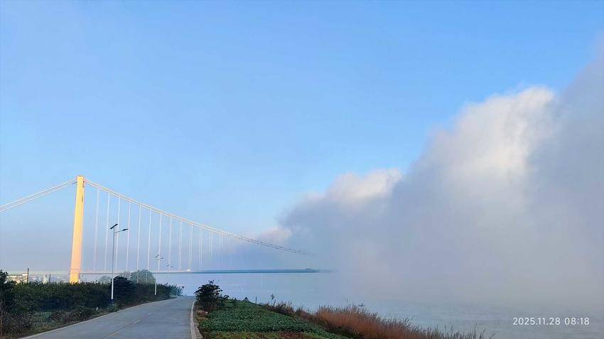 湖北日报客户端讯(通讯员 艾翠娥)11月28日清晨,伍家岗长江大桥笼罩在晨雾中,阳光初洒桥塔,江雾与蓝天相映,如仙境般的城市风光尽显艾家之美。
