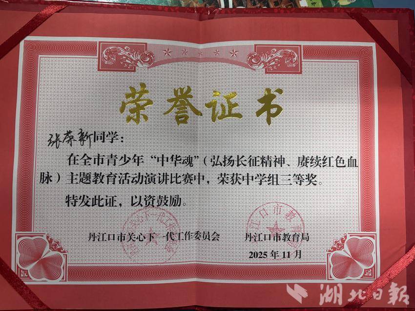 湖北日报客户端讯(通讯员 周政)近日,丹江口市全市青少年“中华魂”(弘扬长征精神、赓续红色血脉)主题教育演讲比赛落下帷幕,来自偏远乡村的浪河中学师生斩获佳绩——年轻女教师滕正聪指导的学生张容新,凭借真挚的情感与深刻的感悟,在中学组激烈角逐中荣获三等奖,为乡村教育注入红色动能。