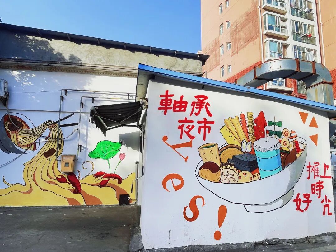 踏入夜市,浓郁的工业复古风瞬间包裹周身。斑驳的墙面被创意唤醒,热辣翻滚的面条彩绘栩栩如生,盛满特色小吃的彩绘瓷盘憨态可掬,“摊上好时光” 的俏皮文案直白又暖心,每一处细节都透着市井生活的亲切与鲜活。