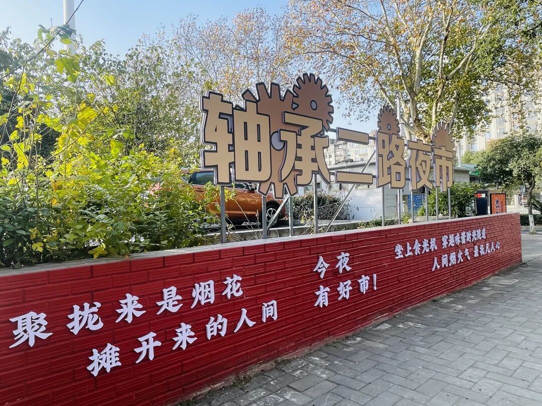 脚下的柏油路面更藏着巧思,“轴承夜市,你好” 的字样间,内嵌着一枚枚鲜明的齿轮图案 —— 这不仅是襄阳轴承厂最深刻的工业烙印,更是新夜市向半个多世纪岁月致敬的 “怀旧暗号”。行走其间,老厂区的厚重工业质感与市井生活的鲜活烟火气无缝衔接,让人在一步一景中感受时光流转。