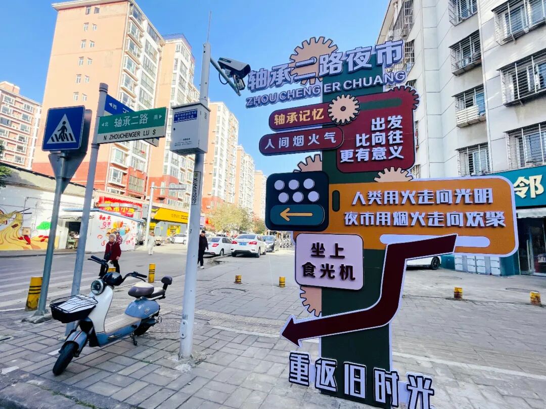夜市入口处,齿轮造型的导视牌格外吸睛,精准复刻了 1968 年工厂建立时的工业元素。搭配上趣味十足的文案标语,巧妙串联起老厂的 “工业温度” 与夜市的 “生活热气”,让逛夜市不再是单纯的寻味之旅,更变成了一场穿越回老襄阳的沉浸式轻旅行。
