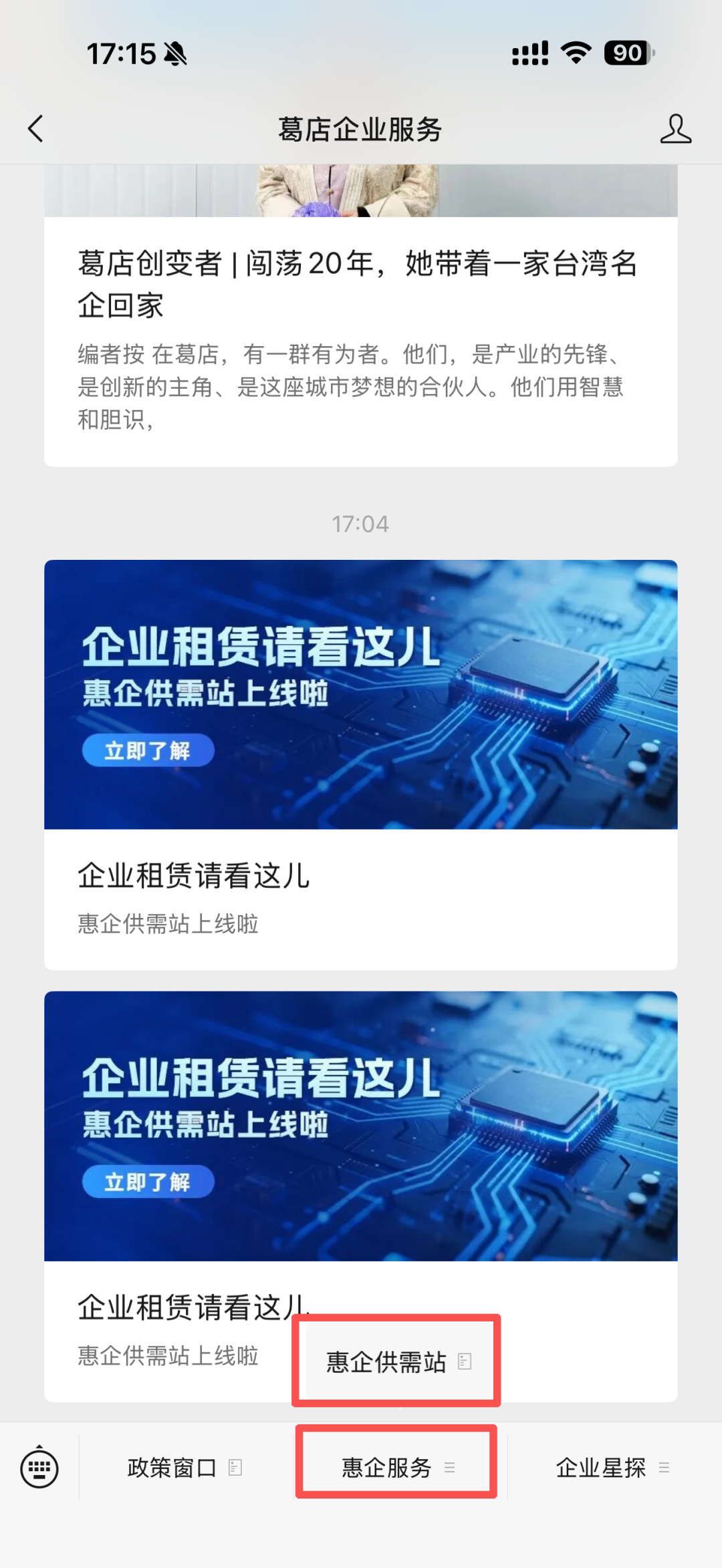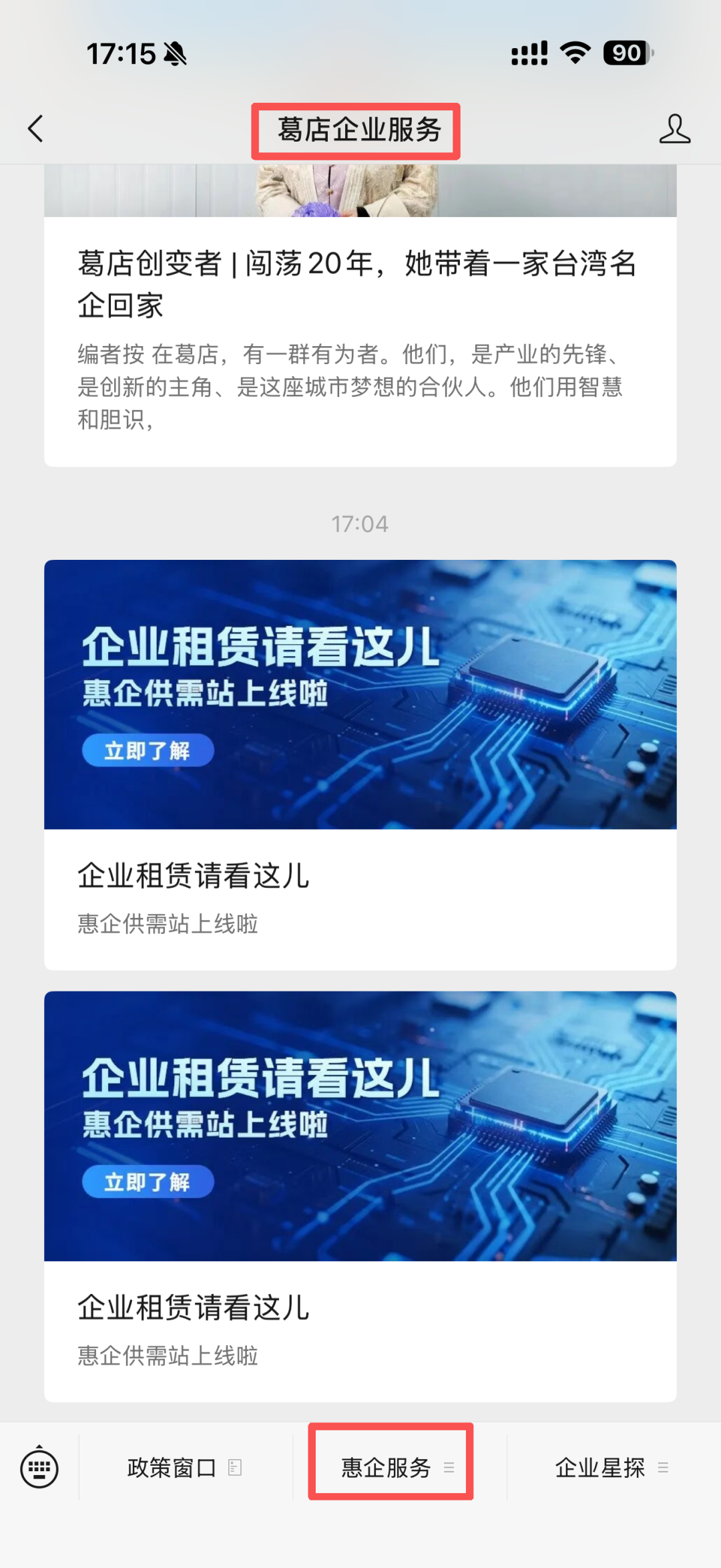咨询信息哪里找?可通过“葛店企业服务”微信公众号菜单栏查看。