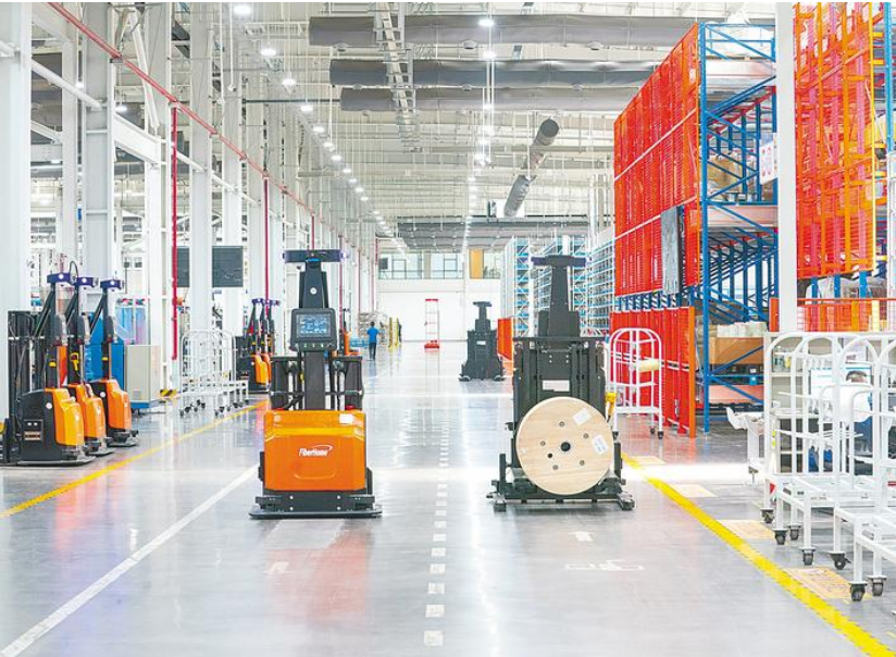 烽火通信智能工厂,5G和数字孪生技术构建的“透明车间”里,AI系统实时调度生产任务。(湖北日报全媒记者 魏铼 摄)