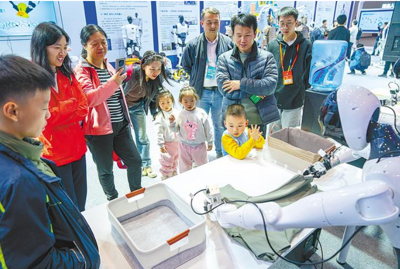 11月22日,中国光谷科技会展中心,观众在湖北人形机器人创新中心展台参观,人形机器人“表演”叠衣技巧。(湖北日报全媒记者 魏铼 摄)