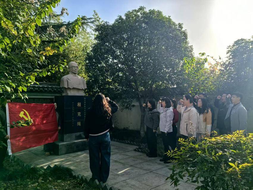 上午10时30分,全体人员怀着崇敬之心抵达基地,在庄严肃穆的程克绳革命烈士纪念像前整齐列队。面对鲜红的党旗,中心党支部书记杨禛领誓,全体党员高举右拳、庄严宣誓,铿锵有力的誓言回荡在苍松翠柏间,既是对革命先烈的深切缅怀,更是对党忠诚、践行初心的庄严承诺,进一步坚定了为共产主义奋斗终身的信念。