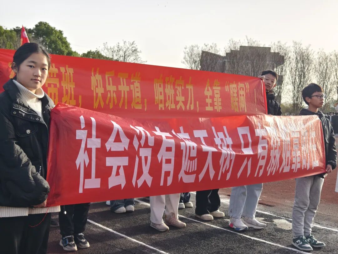 “潘梓龙,加油!”“二班的孩子们好样的!”方阵走过主席台时,校长严迎锋和其他4位校领导全体起身挥手,不仅精准叫出学生名字,还能说出他们的体育特长。不远处,“社会没有遮天树,只有淼姐靠的住” 横幅格外醒目,学生们齐声喊出 “淼姐最棒”,“淼姐”是八年级(1)班的班主任陈淼老师。
