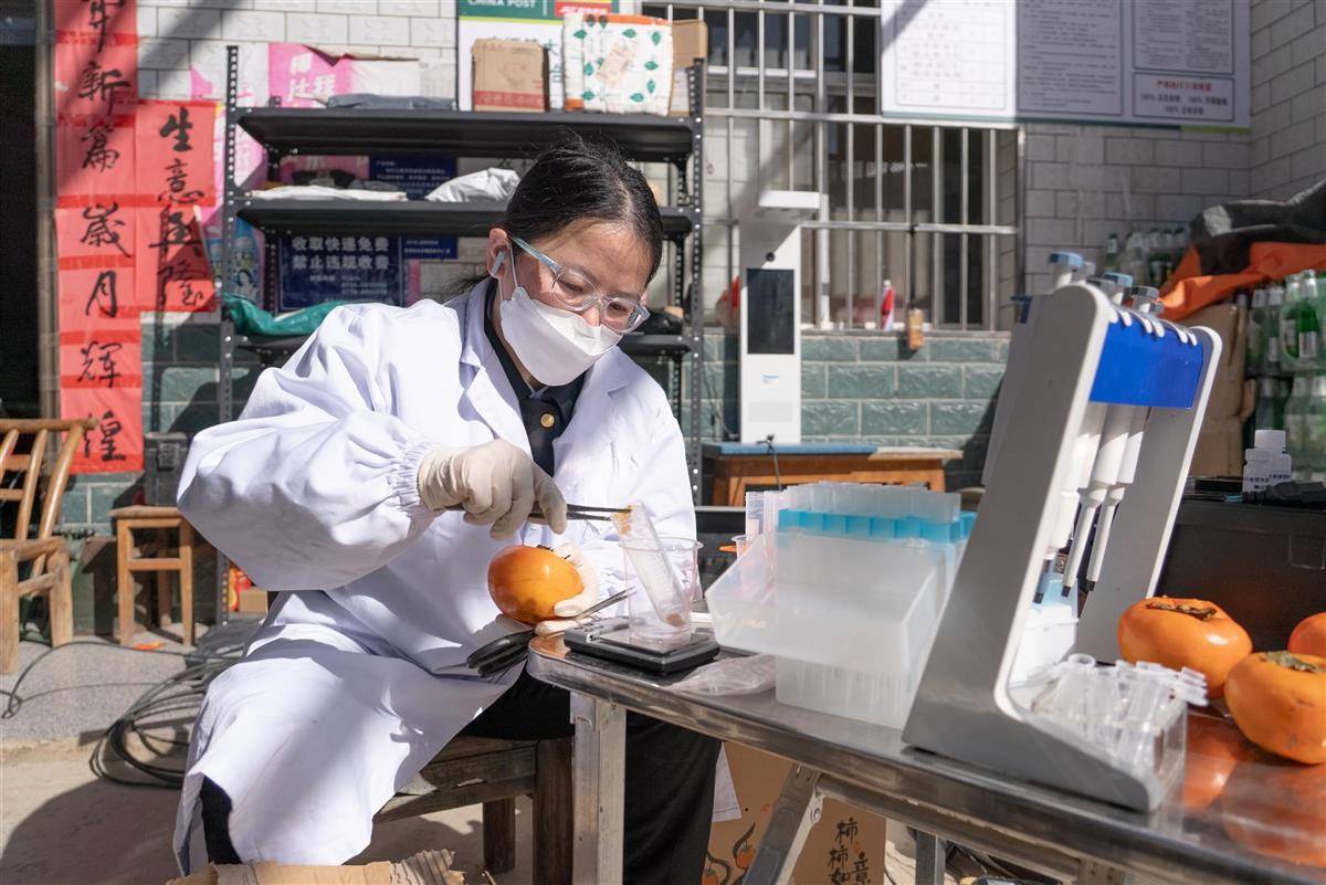 工作人员检测苹果柿含糖量。