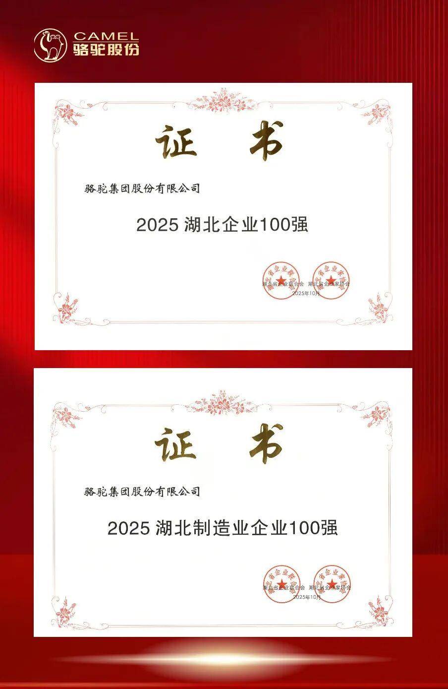 湖北日报讯(记者汪璐、通讯员陈嗣君)近日,湖北省企业联合会、湖北省企业家协会联合发布“2025湖北企业100强”“2025湖北制造业企业100强”榜单,骆驼集团双双上榜。