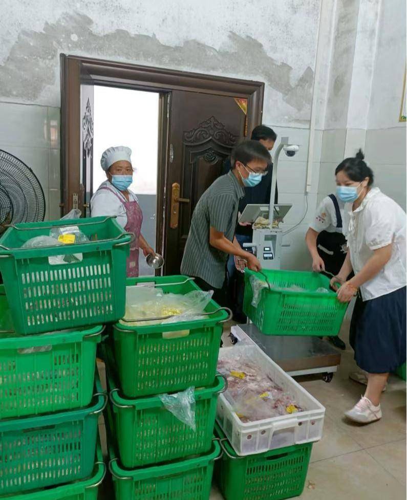 45分钟实操演练环节,大家分组轮流上手:从用容器装取食材练电子秤操作,到模拟国补、自费食材的入库称量登记,再到按师生用量估算出库重量,库管全程巡回指导,校长现场盯细节纠动作,参训人员边学边练、互助交流,技能在实操中快速落地。