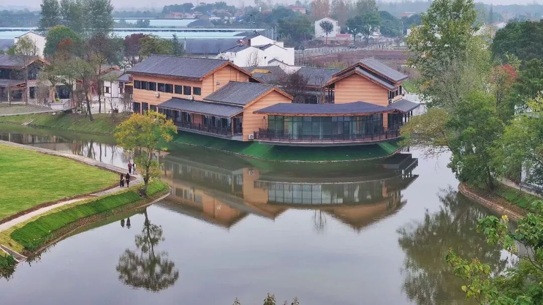 晏家河畔,孝昌县陡山乡新街村郭李营·心悦岛景区,小桥流水、亭台楼阁、非遗体验、咖啡飘香,游客熙熙攘攘。