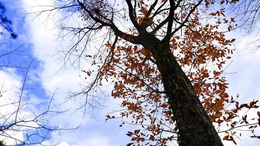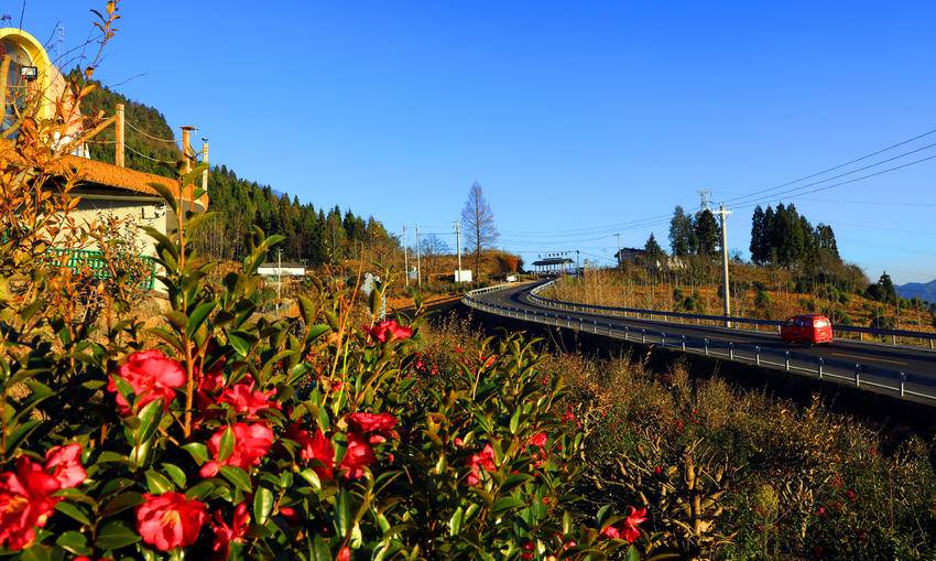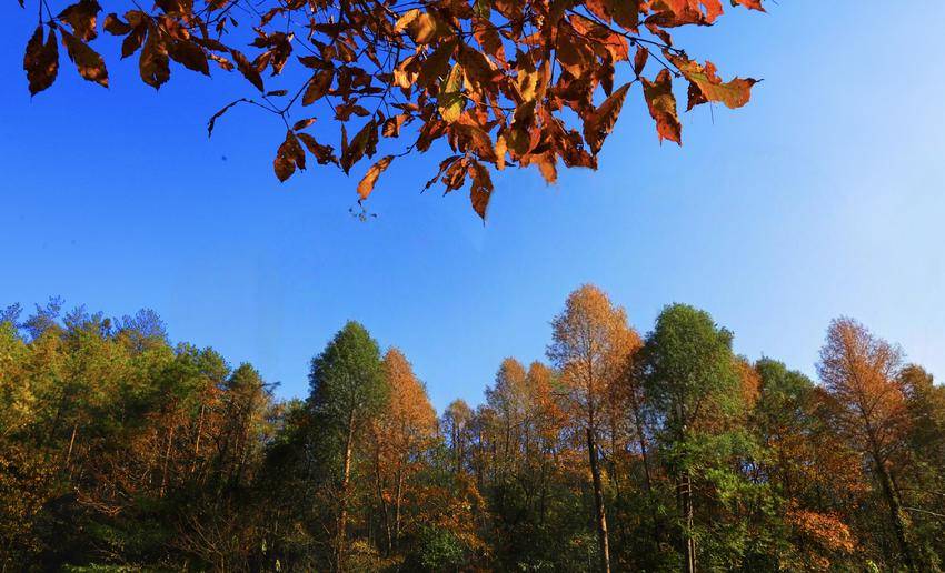 这里山水如诗,每一处皆是天然画卷。高山清秀,峻岭逶迤。微风轻拂,携着林木的清爽。山涛林浪间,红叶似火,黄叶如霞,热烈而张扬;偶有晚开的红花,在冬阳里倔强绽放,为清冽的冬季再添一种灵动与生机。
