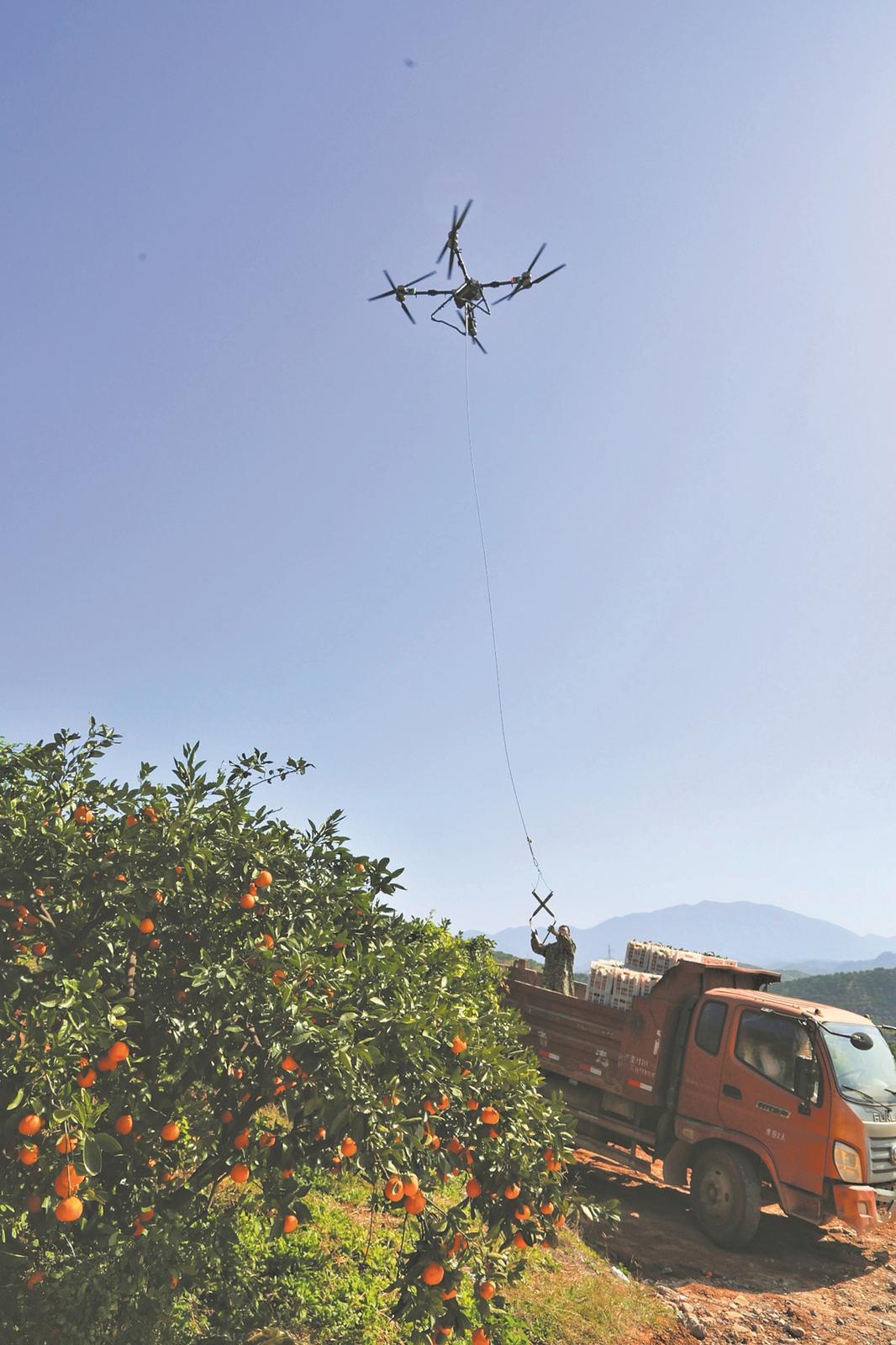 11月27日,南漳县巡检镇峡口社区的千亩柑橘园中,一架超大型无人机呼啸而起,吊载着50公斤新摘的柑橘精准飞向路边货车。业主郭正法投资6万余元引入此技术,实现柑橘高效转运。金黄橘海间“空中走廊”的常态化运作,成为科技赋能山区农业降本增效的生动缩影,展现了智慧农业在乡村振兴中的实践价值。(来源:襄阳日报 谢琪 摄)