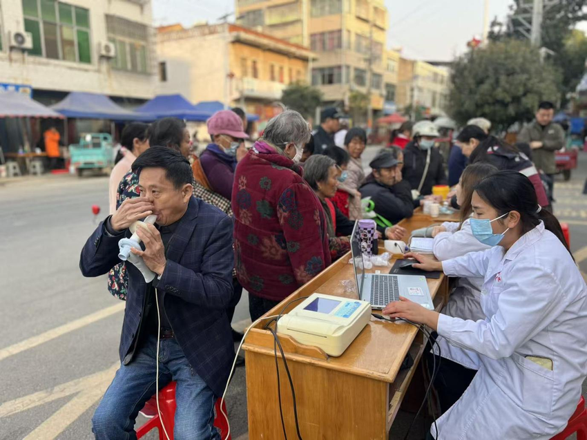 义诊现场秩序井然,医护人员热情接待群众。诊疗区医生细致问诊查体,为高血压、糖尿病等慢性病患者提供诊疗建议与康复方案,护理人员为群众提供免费的血压、血糖检测、肺功能筛查并解读报告,健康宣教人员普及健康知识,发放宣传册与纪念品。