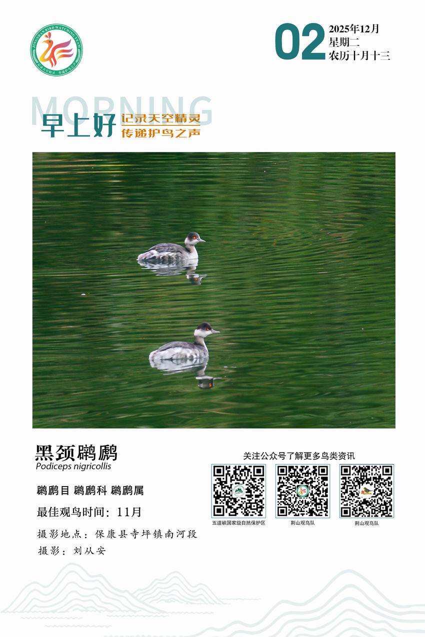 黑颈䴙(pì)䴘(tī)(英文名:Black-necked Grebe,学名:Podiceps nigricollis),是䴙䴘目䴙䴘科䴙䴘属的鸟类。以其独特的黄色耳簇羽毛著称,耳簇羽毛在繁殖季节会伸展至耳羽后方。分布广泛,包括欧亚大陆、非洲部分地区、北美西部乃至中美洲,以及中国。常栖息于沼泽、池塘、湖泊或有覆盖物的溪流中。(湖北五道峡国家级自然保护区管理局)
