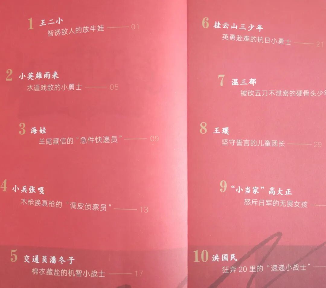 【《烽火淬英华》“读本”收入的“十大(组)”少年英雄有:王二小、雨来、海娃、张嘎、潘冬子、挂云山三少年(组)、温三郁、王璞、高大正、洪国民(湖北罗田)】