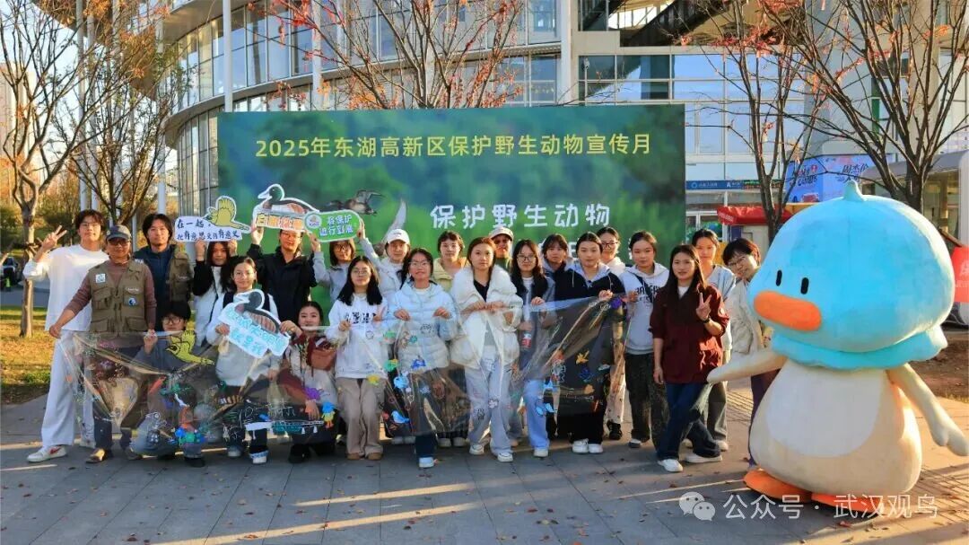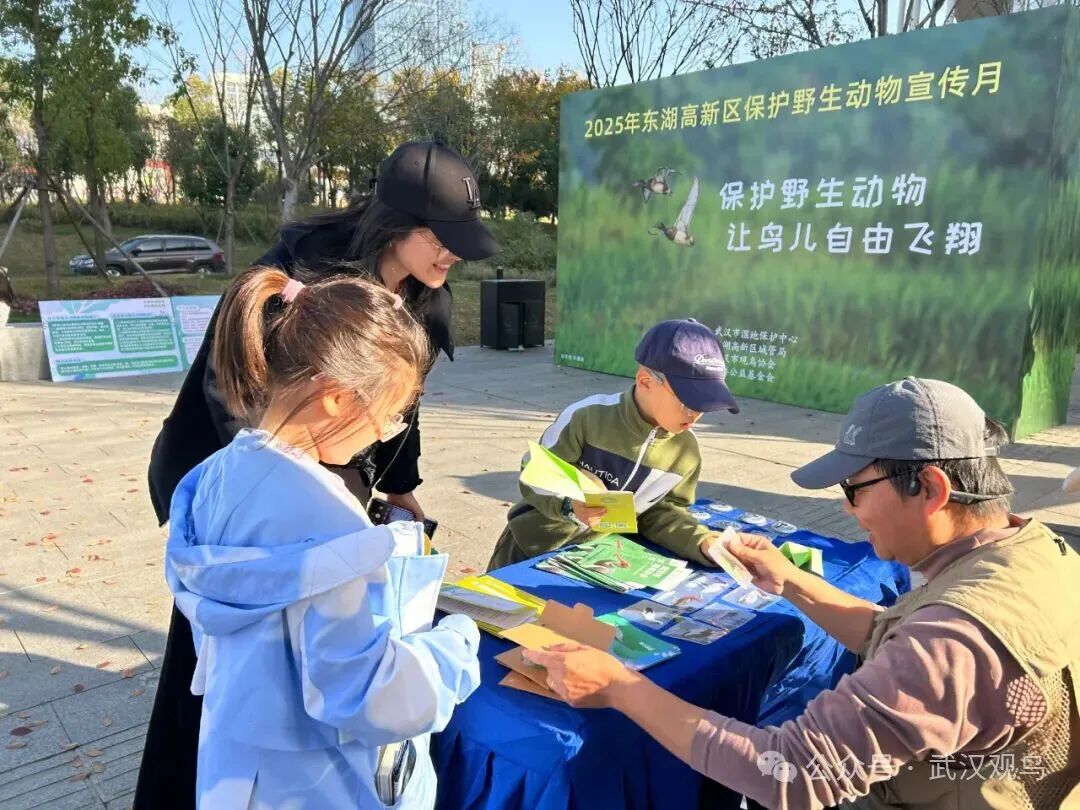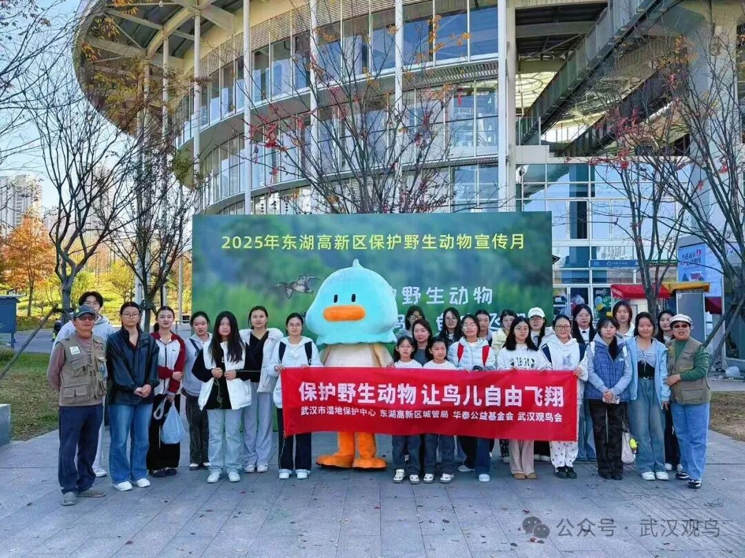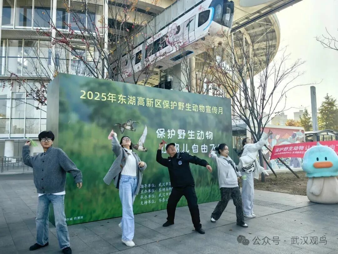 11月28日下午,由武汉市湿地保护中心指导、东湖高新区城管局主办、武汉市观鸟协会承办、华泰公益基金会支持、武职大长江环保团队提供公益协助的东湖高新区保护野生动物宣传月——“保护野生动物,让鸟儿自由飞翔”青头潜鸭主题公益宣传活动,在光谷空轨高新大道站广场成功举办。本次活动吸引了众多市民、爱鸟人士及亲子家庭积极参与,现场气氛热烈,公众保护野生动物的意识在寓教于乐中得到有效提升。