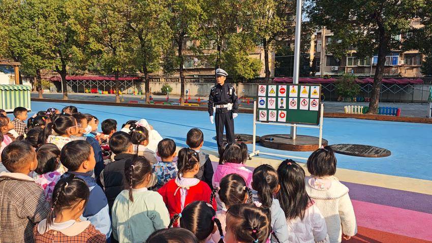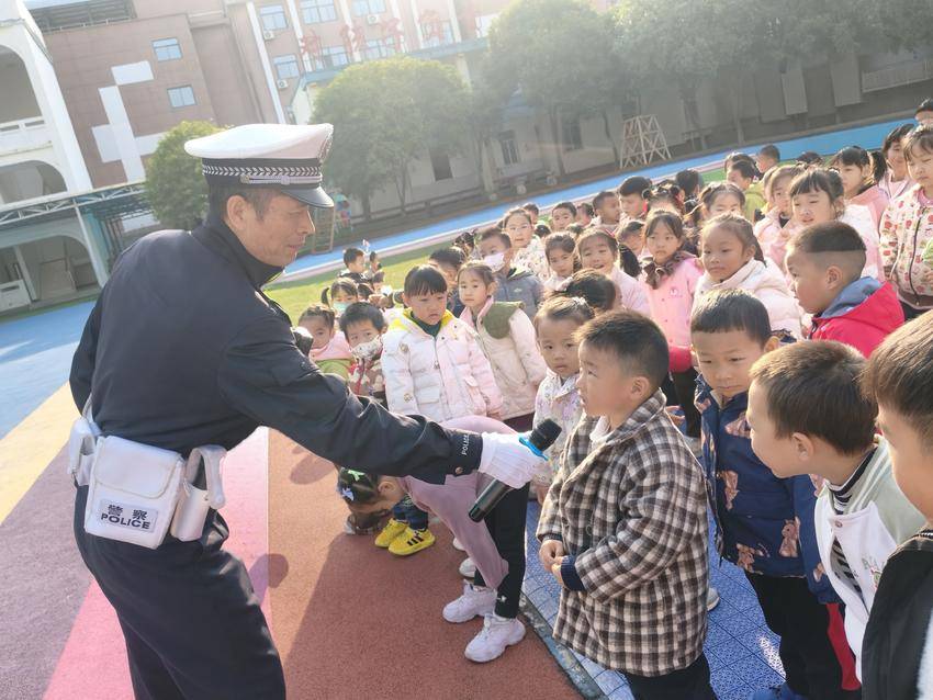 活动伊始,西坝交警中队民警身着专业装备活力亮相,瞬间点燃孩子们的热情。通过趣味问答、装备拆解展示、手势模拟教学等互动形式,民警用童趣化语言解读红绿灯、斑马线等交通标识的含义,现场示范“停止”“直行”等基础指挥手势,不仅让“红灯停、绿灯行、黄灯亮了等一等”的安全准则深植童心,更让孩子们直观感受到交警职业的责任与意义。