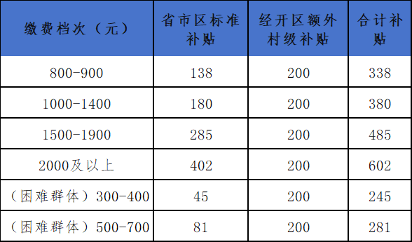2025年,本区城乡居民基本养老保险缴费档次在800元至8800元之间,不同档次对应明确的政府补贴(含省、市、区标准补贴及经开区额外村级集体补贴),具体如下: