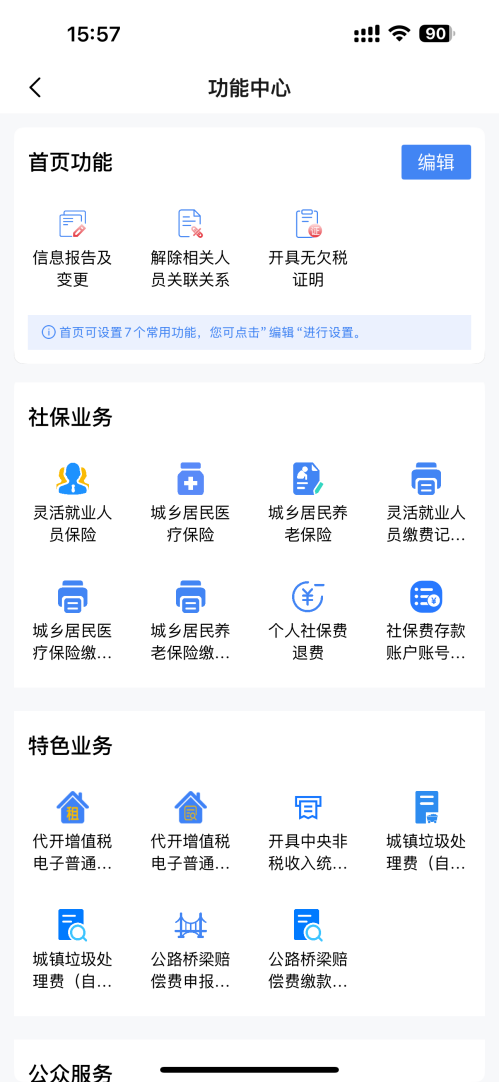 3.下滑屏幕找到社保业务,点击“城乡居民养老保险”