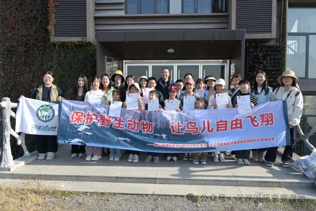 11月是全国保护野生动物宣传月,沉湖国际重要湿地也迎来了候鸟翩跹、万羽翔集的最美时节。围绕2025年宣传月主题——“保护野生动物 让鸟儿自由飞翔”,11月30日由武汉市蔡甸区沉湖湿地自然保护区管理局主办的自然教育活动精彩开启。一群可爱的“小小湿地巡护员”走进沉湖国际重要湿地,在专家和一线巡护员的带领下,开启了一场融合知识、行动与感悟的生态探索之旅。活动通过实地巡护、鸟类观察与互动体验,引导孩子们在生态环境中理解人、湿地与野生动物共生共荣的关系。