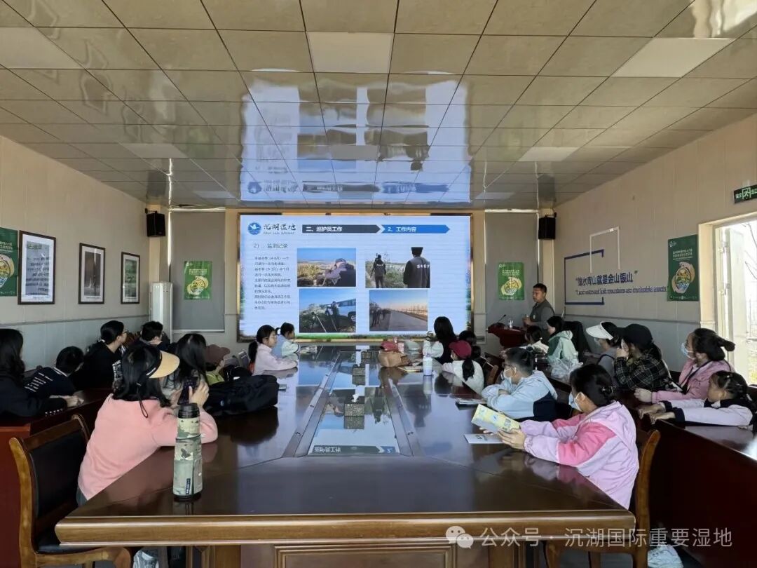 上午,孩子们来到沉湖七壕保护站,认真聆听一线巡护员讲述日常工作——从清晨徒步巡查到监测水位变化,从记录鸟类动态到劝阻人为干扰。朴实而生动的故事让孩子们对这份默默守护的职责充满敬意。“原来巡护员叔叔工作要走那么远的路!”一位小朋友感叹道。随后,大家跟随巡护员踏上真实的巡护路线,在行走中观察湿地植被、辨识生境特征,并参与简短问答,初步建立起对湿地保护工作的直观认知。