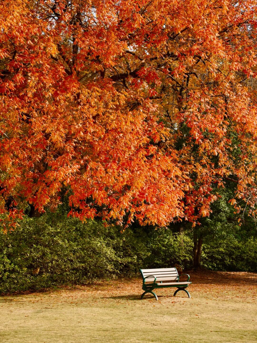 逛完建议在去旁边的杜鹃园溜达一下,草坪上的长椅背后是盛大的红叶林,很出片。