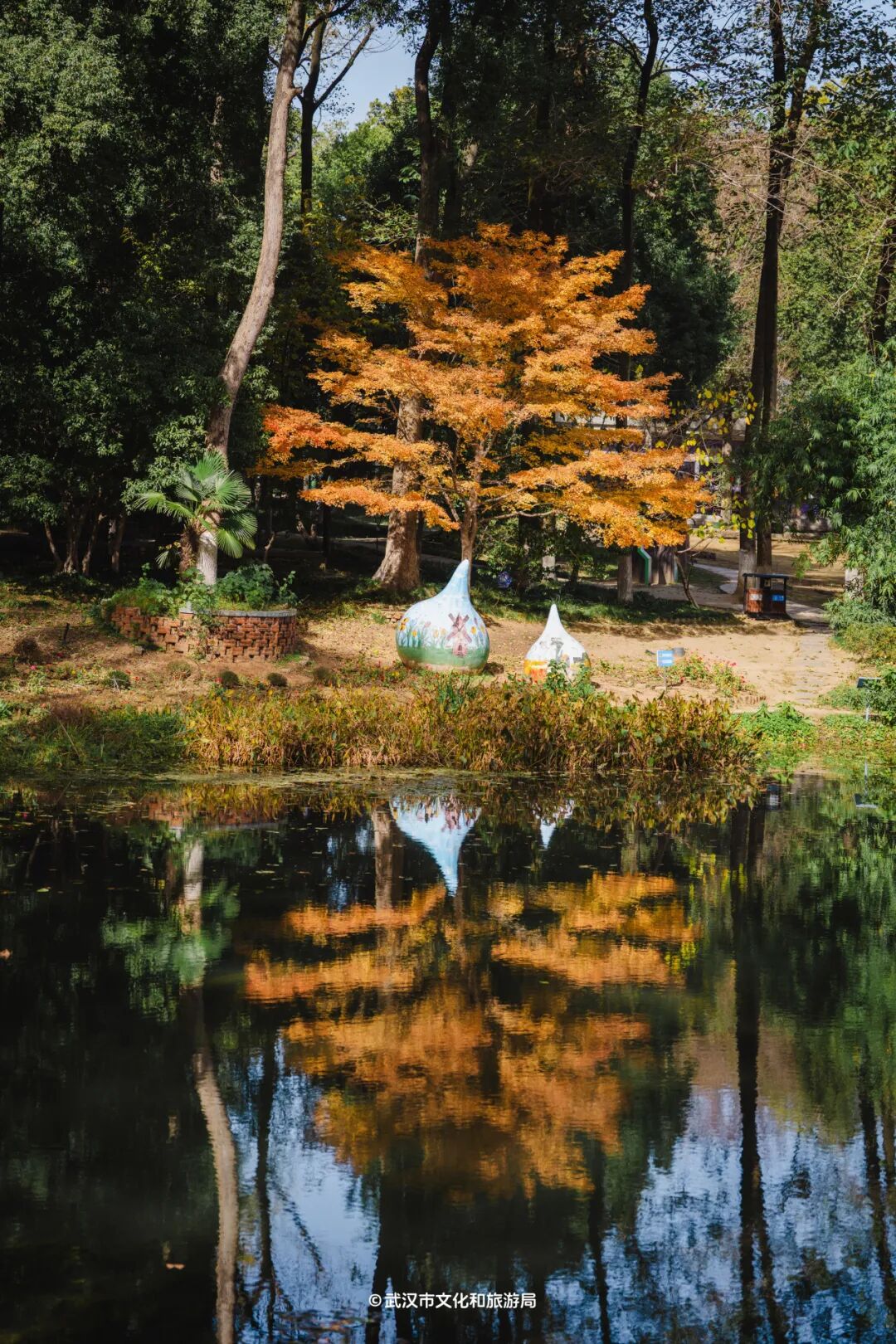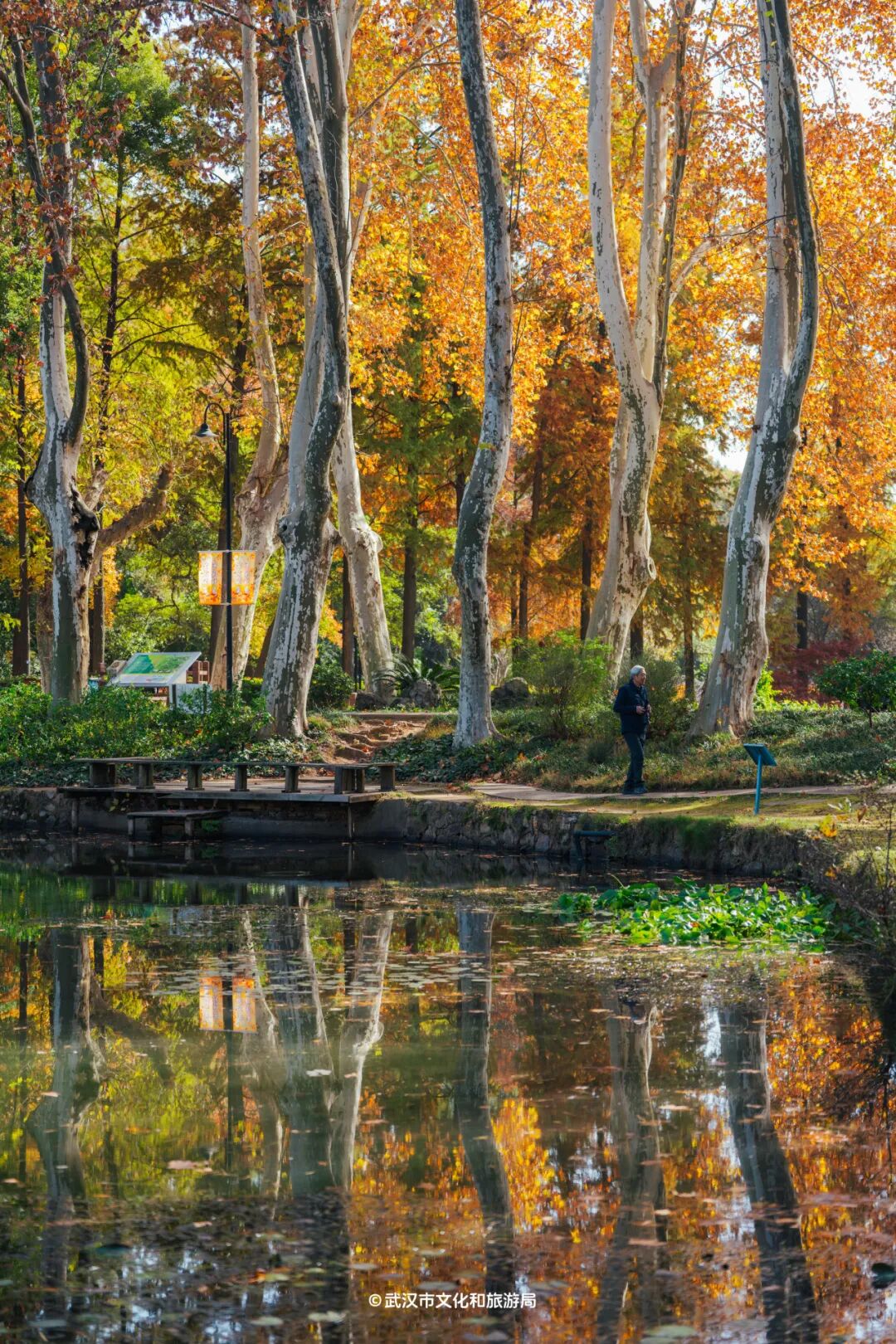 △走到「水生生态区」,池水像一面镜子,倒映出满树鎏金的树,更美了。