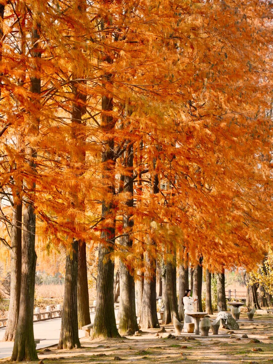 不过旁边的杉树“噌”地变红了!像一起换上了“红毛衣”。下午15点-16点,阳光斜斜地洒下来,像羽毛般轻盈的树叶闪着光,更美了。