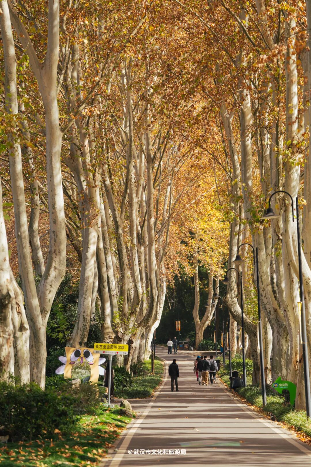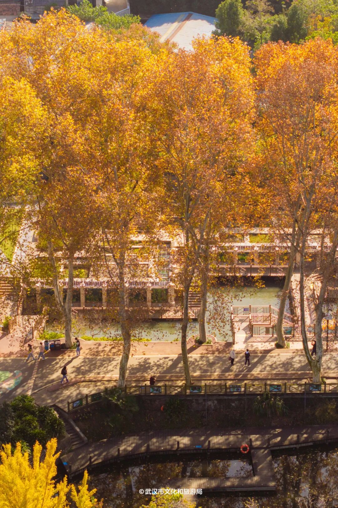 中国科学院武汉植物园近20米高的二球悬铃木树冠在空中搭出金色穹顶,绵延500余米,阳光洒下斑驳光影。