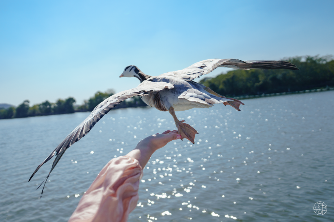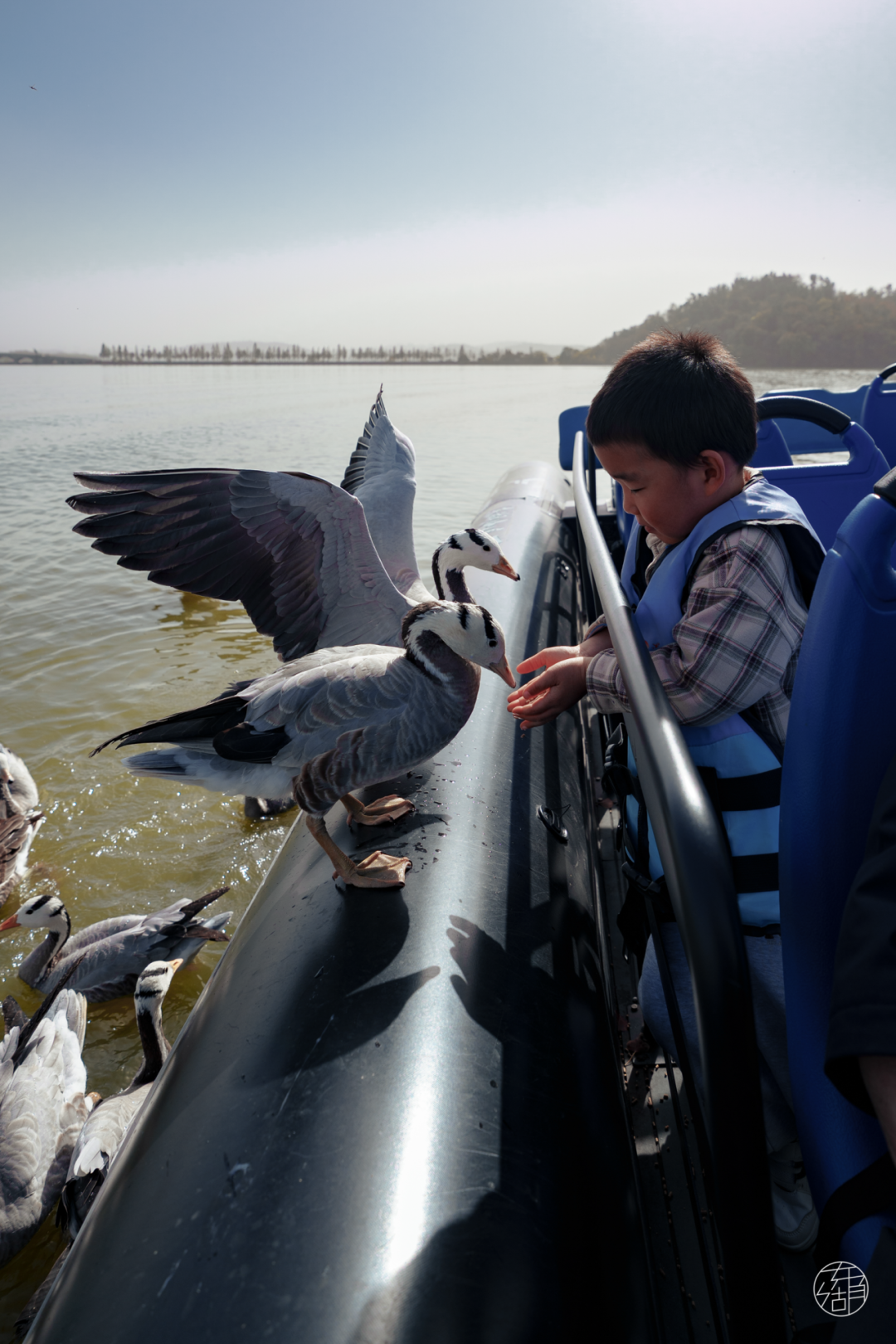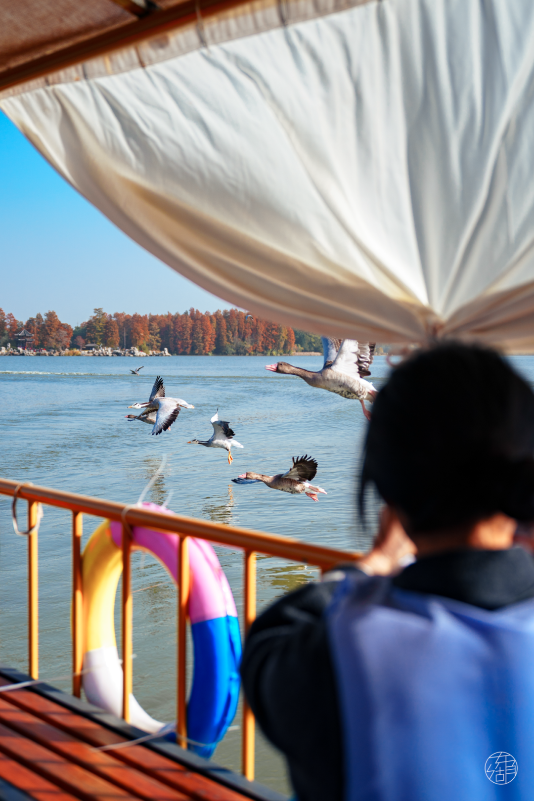 等船开到湖心,雁群又换了一种画风:它们轻盈地落在水面上,变成了一群乖巧的「粘人精」,此时抓一把饲料,保证它们围着你打转,咕咕叫个不停。
