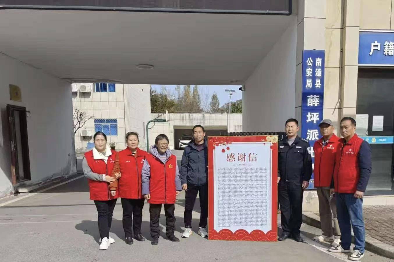 徐先生与义工们赶赴南漳薛坪派出所为张经纬送来一封巨幅感谢信。