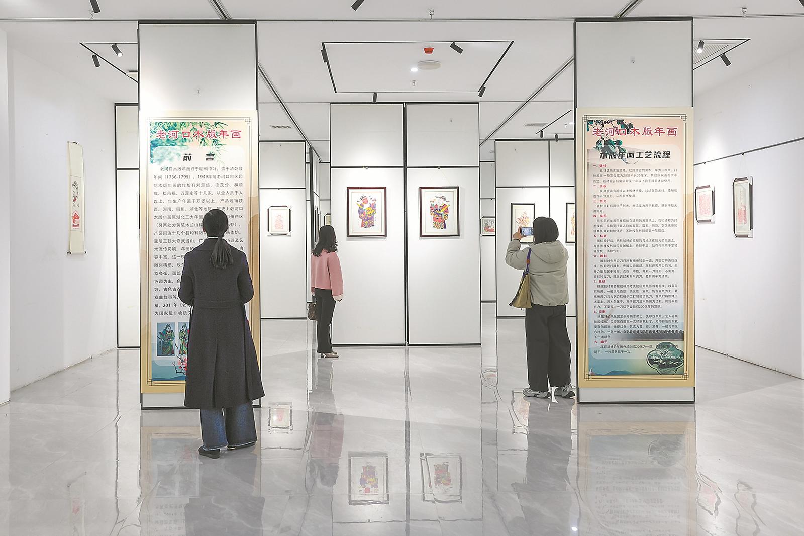 11月26日,市民在老河口市群艺馆木版年画非遗体验馆参观,感受非遗魅力。老河口市是湖北省目前仅存的木版年画产地。为保护传承这一民俗瑰宝,2011年,老河口木版年画被列入国家级非物质文化遗产名录。(来源:襄阳日报 杨东 摄)