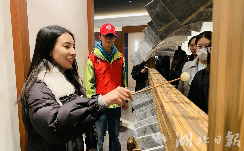 与此同时,《欢乐颂》《小河淌水》《青花瓷》在志愿者李家祺、刘晨阳的编磬、编钟演奏中缓缓流淌中,让游客真切“对话”古今中外经典乐曲,文化代入感瞬间拉满。“亲手敲一下才知道,古人的智慧太惊人了!”在沉浸体验区,游客们的赞叹声此起彼伏。志愿者引导大家敲击编钟复刻版,当同一钟体因敲击位置不同发出两种音高各异的清脆乐声时,“一钟双音”的精妙让在场者无不称奇。