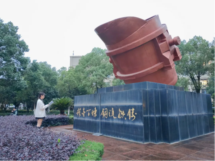 它曾是钢厂铸造车间的核心设备,在高温炉火中千百次承接炽热的铁液,亲眼见证1400度的铁流在转炉中蜕变为钢材的奇迹,身上每一道纹路都镌刻着工业时代的硬核记忆。如今褪去生产线的烟火气,它以雕塑之名伫立校园,底座上镌刻的“精金百炼 钢浇铁铸”的烫金大字,既是对冶金工艺的精准诠释,更是武科大百年精神的凝练表达。
