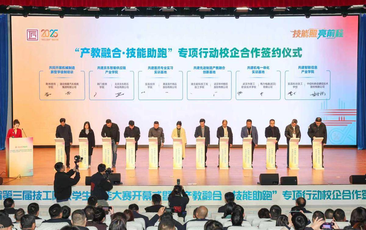校企合作是技工院校提升办学质量、打造特色品牌的重要途径。签约仪式上,武汉铁路技师学院与岚图汽车科技股份有限公司、襄阳技师学院(襄阳科技职业学院)与比亚迪集团、宜昌科谷技工学校与中信科移动通信技术股份有限公司等12组校企代表现场签署合作协议。