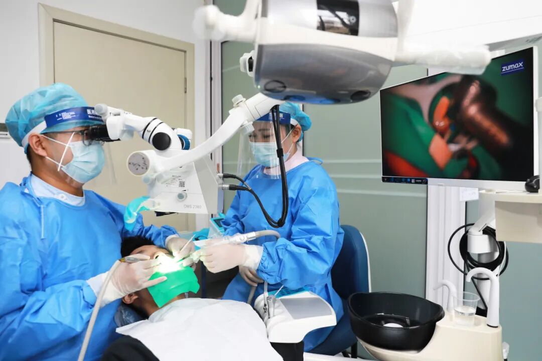 在经过综合评估和反复讨论研究后,最终,口腔医学中心团队为她实施了精密的显微根尖手术:在显微镜下,医生犹如工匠,进行根尖切除、超声倒预备与倒充填,完美封闭感染源头,并植入血浆基质促进组织再生。两小时的手术,终结了患者长达数年的痛苦,成功保住了天然牙。