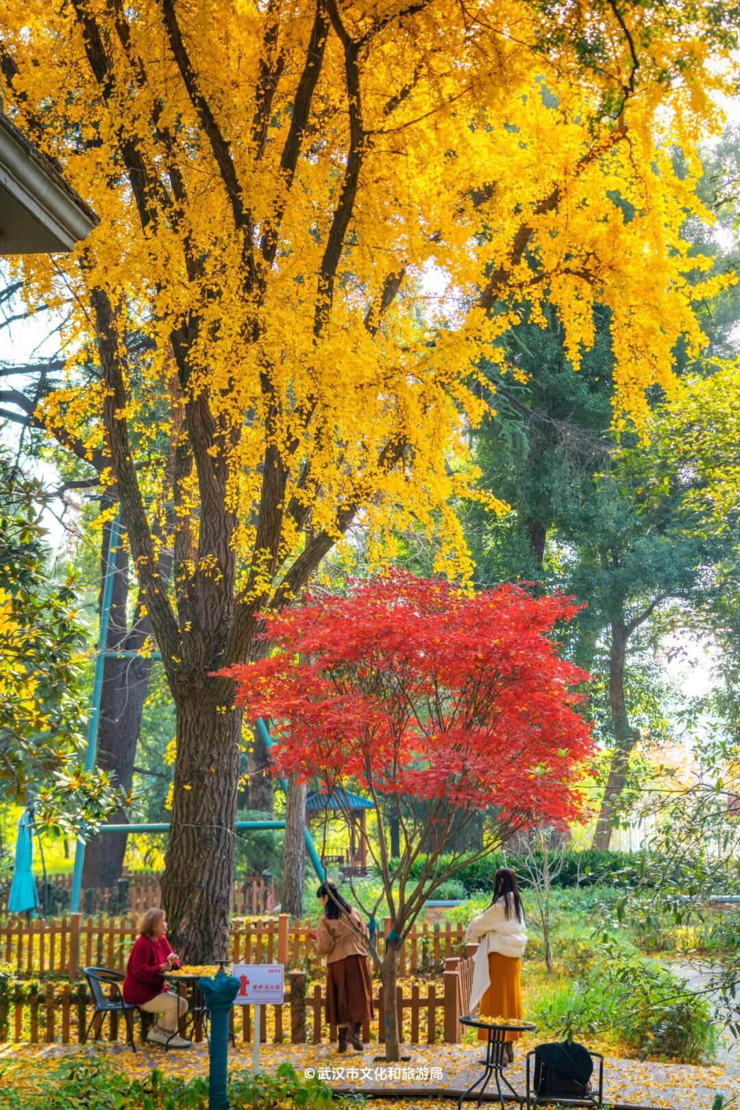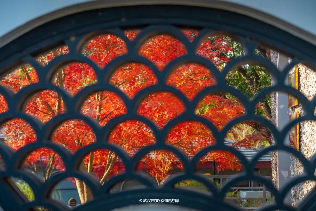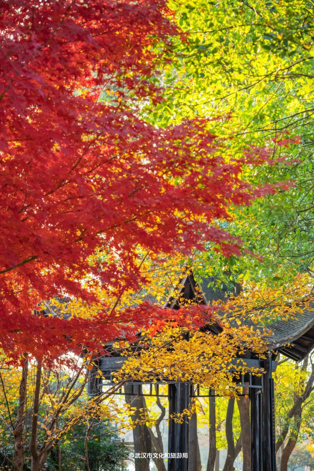 △武汉东湖湿地科普展厅,鸡爪槭红似火,枫香与银杏金黄灿烂,和传统建筑相互映衬,非常鲜艳美丽,拍摄于12月1日