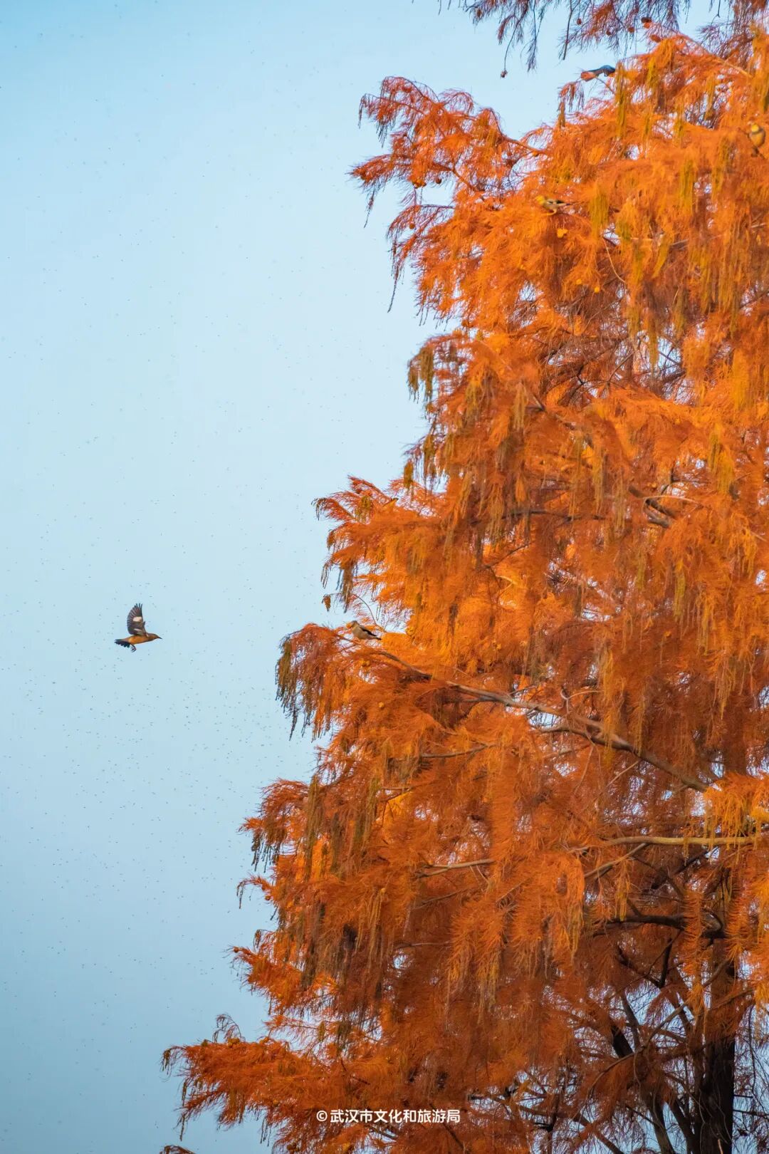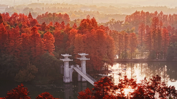 近期的落雁景区彩叶正盛,水边的池杉已经基本红透,进入最美时刻,漫步其中像走入童话森林。