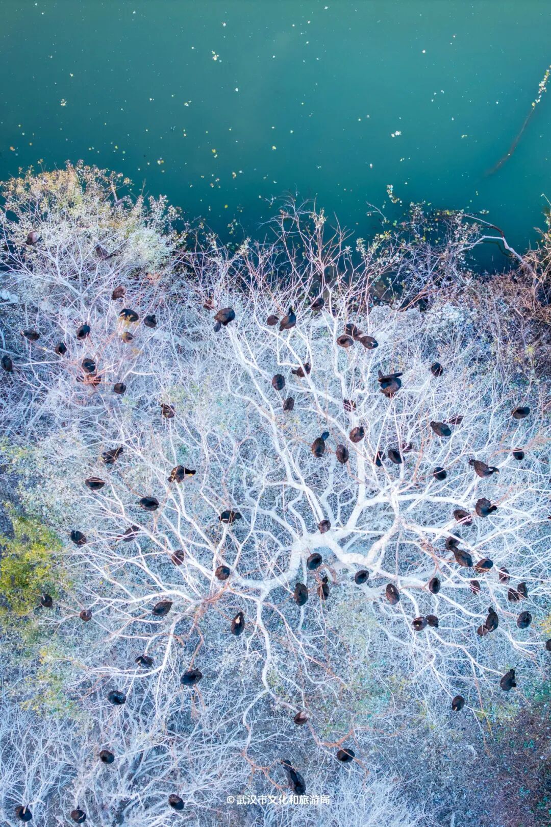 它们吃饱喝足之后就会停歇在树上休息、晾晒羽毛,日复一日,树枝上就沾满了白色的粪便,像积雪,也像雾凇。