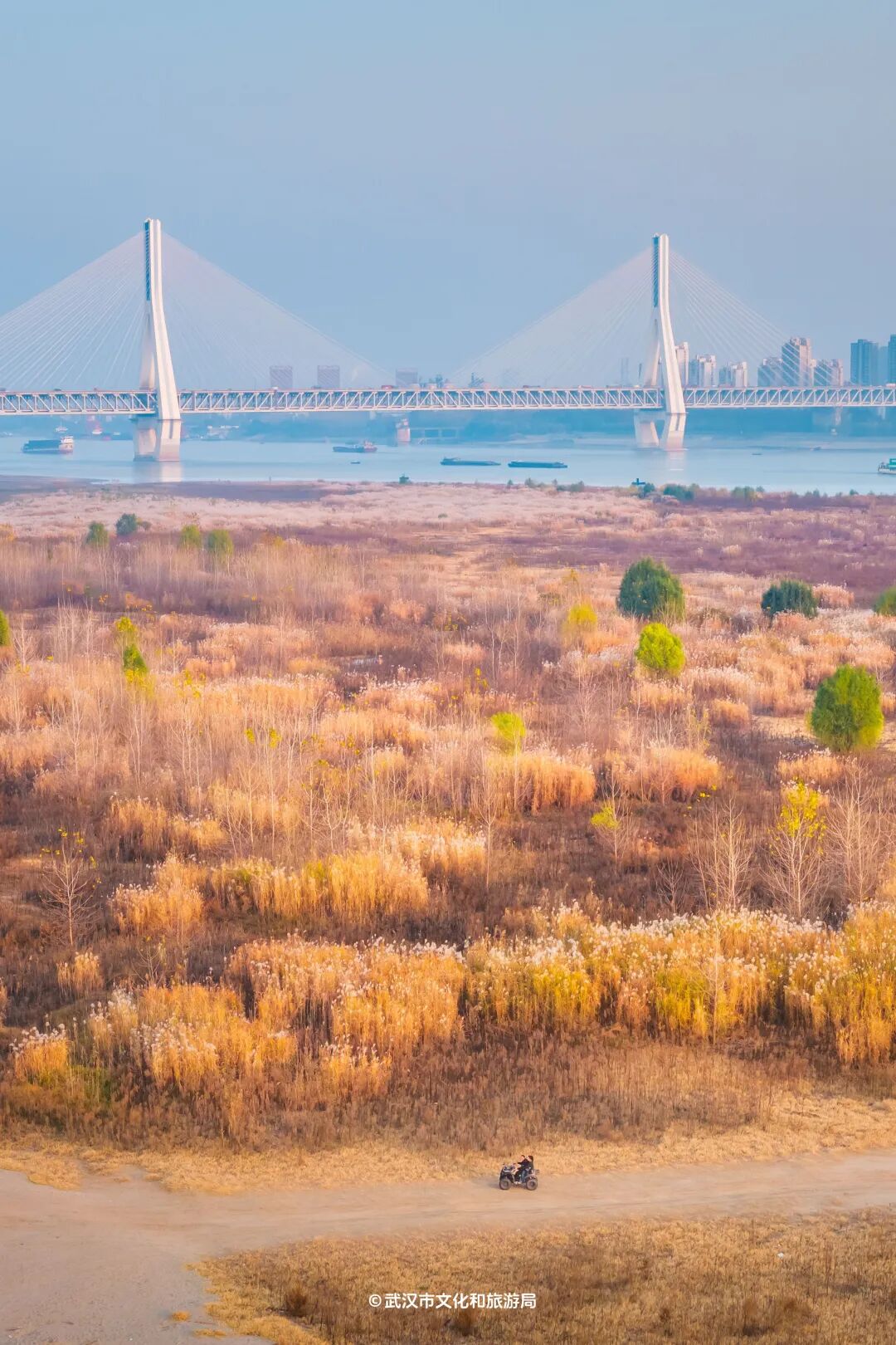 现在的天兴洲农作物基本收获完毕,树木凋零,剩下芦苇荡在风中摇曳,迎接冬天的到来。目前天兴洲轮渡停航,游客前往天兴洲需要预约自驾上洲(预约链接见文末),导航“天兴洲”即可。