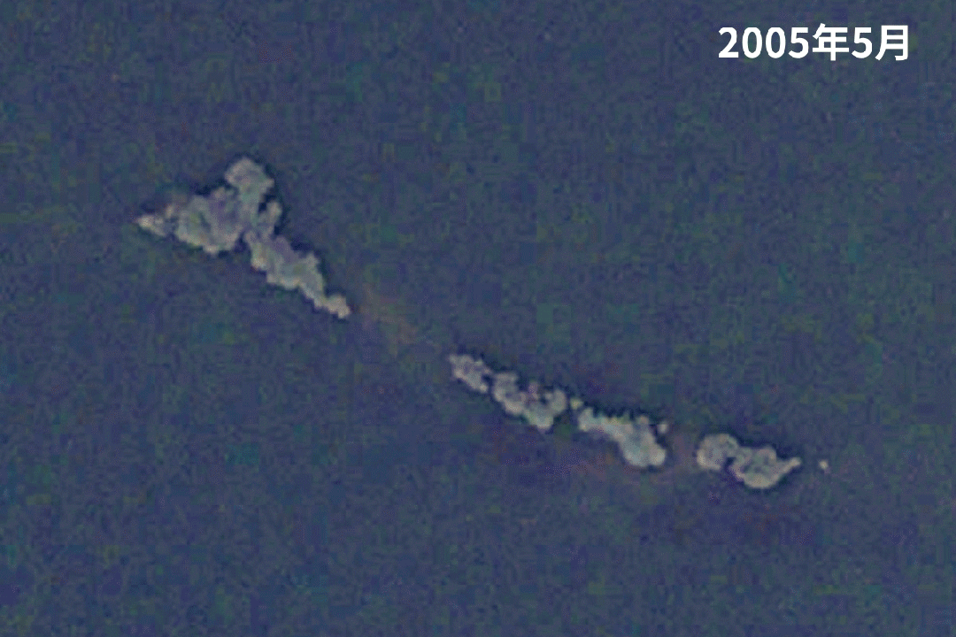 △卫星视角下鸟岛变迁,20年前鸟岛面积狭小,2011年保护工程后,鸟岛面积扩大、树木增多,成为鸟类天堂