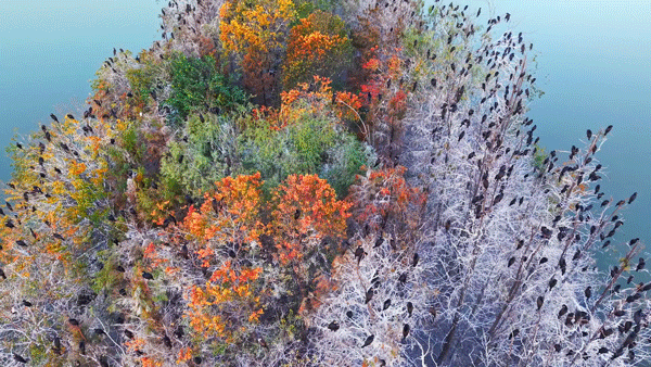 等到来年3月,普通鸬鹚陆续离开武汉,踏上北归的行程,岛上逐渐恢复平静,鸟粪也会被雨水洗刷干净。