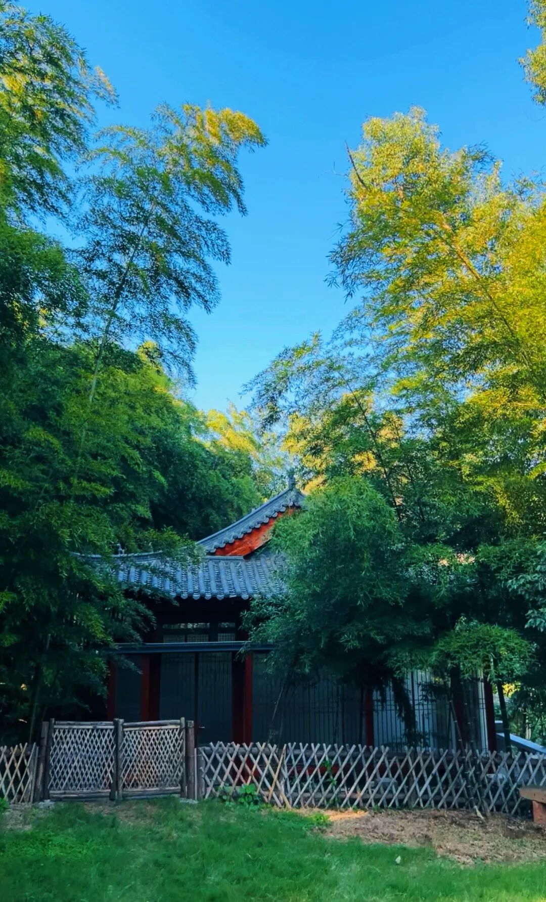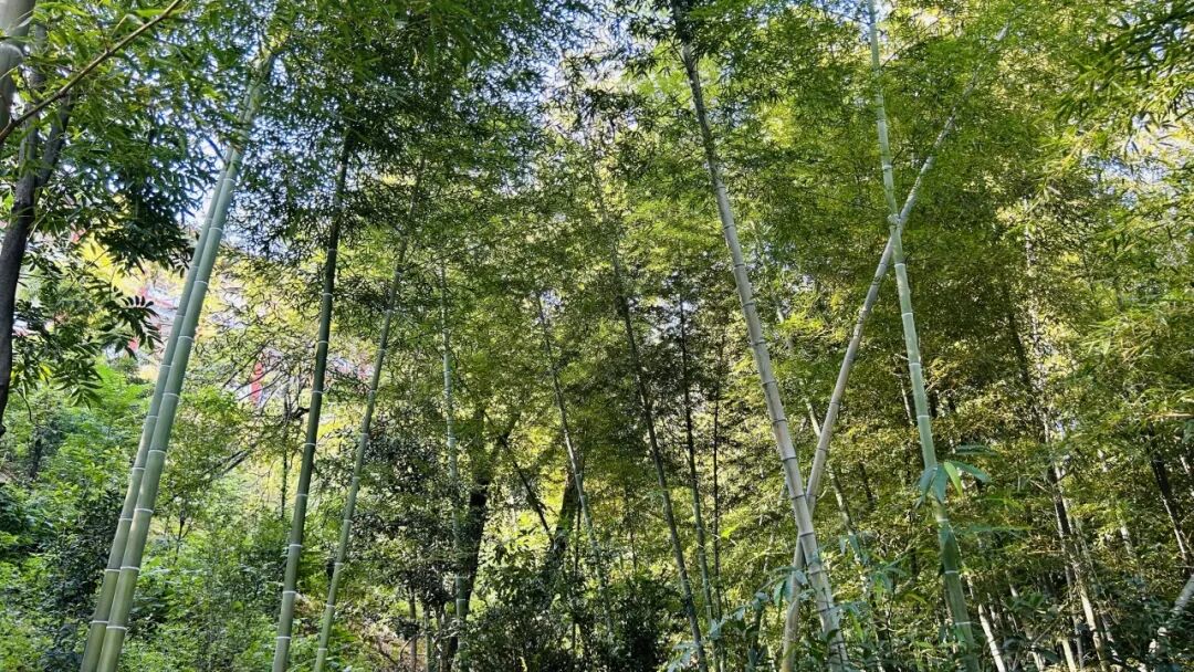 途中还会邂逅超治愈的师父茶园,初冬的茶园少了春夏的繁盛,多了几分沉静的绿意,茶树整整齐齐排列,风一吹就轻轻摇晃,氛围感直接拉满~ 茶园旁的竹林更是宝藏!一脚踏进去,满目青翠隔绝了外界的喧嚣,竹叶在风中沙沙作响,像是在耳边说悄悄话,沿着竹林小径慢慢走,随手拍都是森系大片,连烦恼都被这绿意化解啦~ 穿过竹林,红墙黛瓦映着初冬的天空,庄重又静谧,不妨进去稍作停留,感受片刻的宁静与祥和。