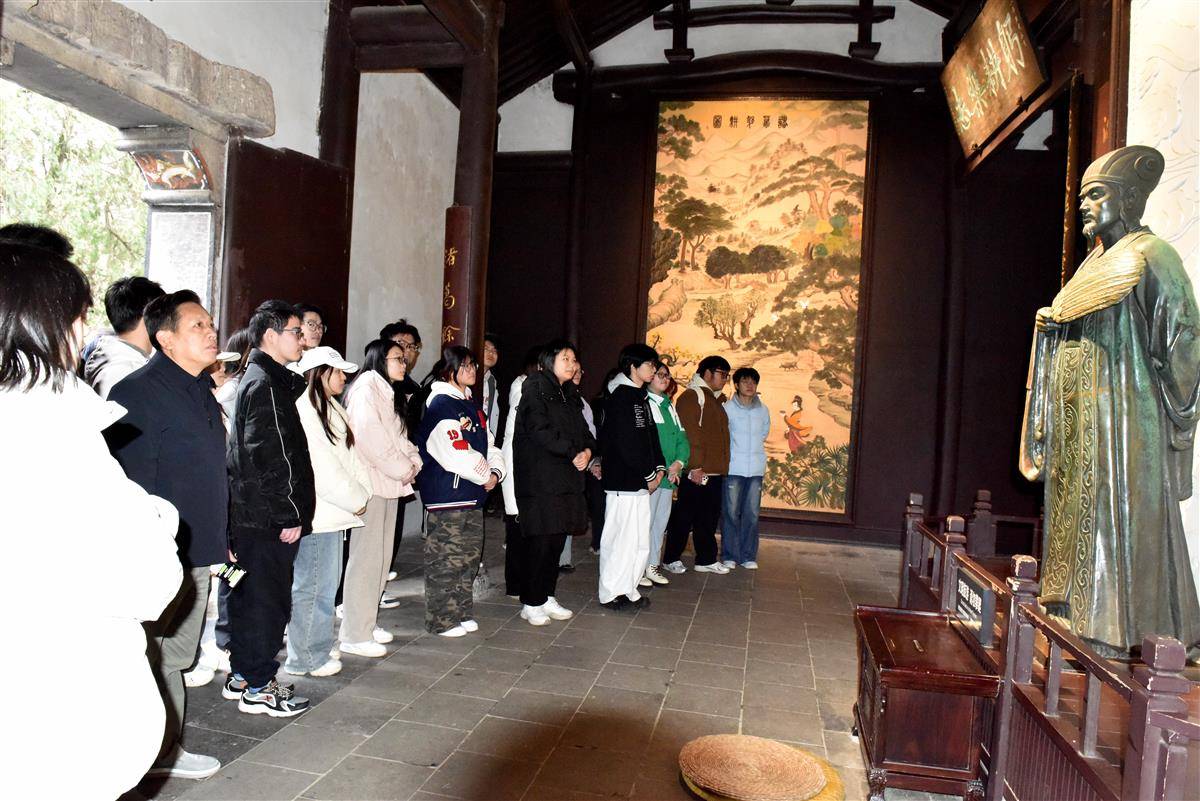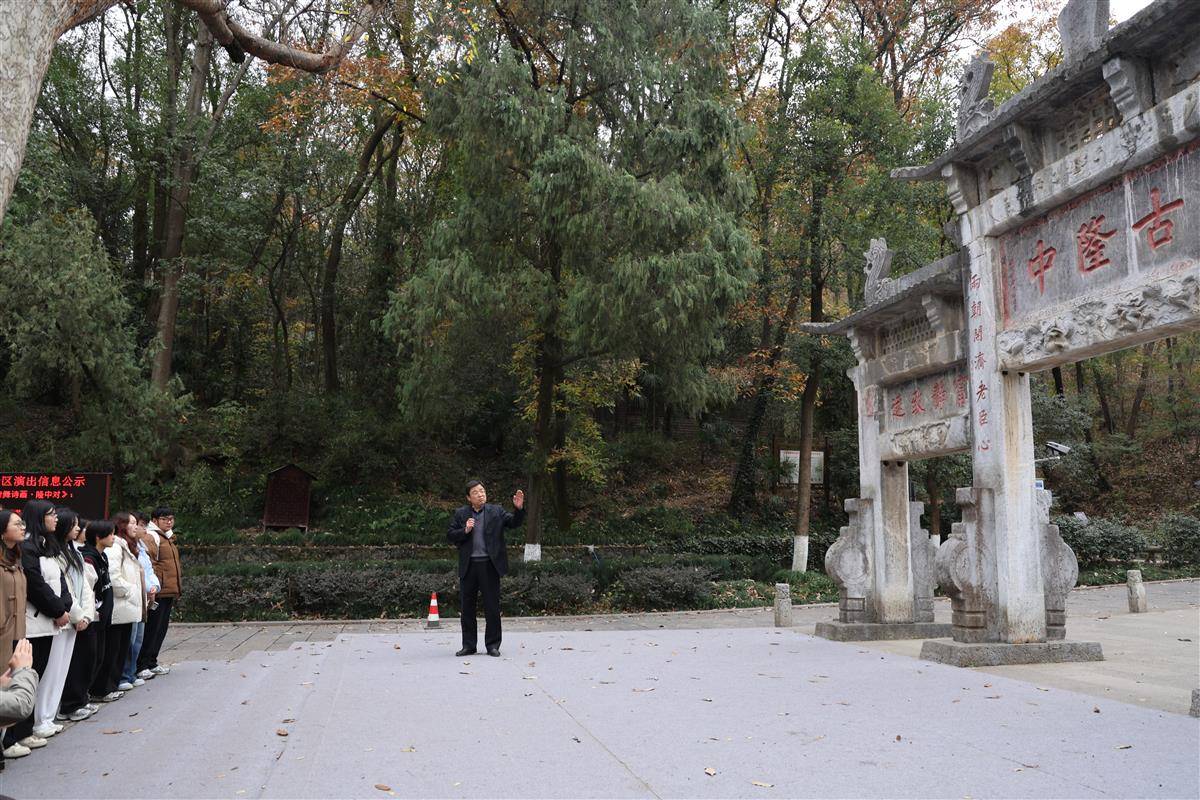 活动中,在古隆中牌坊前,师生们聆听该校文学与传媒学院教授高新伟的讲解。他追溯“古隆中”正匾的历史底蕴,解读“淡泊明志,宁静致远”的精神内核,讲述诸葛亮忠贞为国、鞠躬尽瘁的一生。