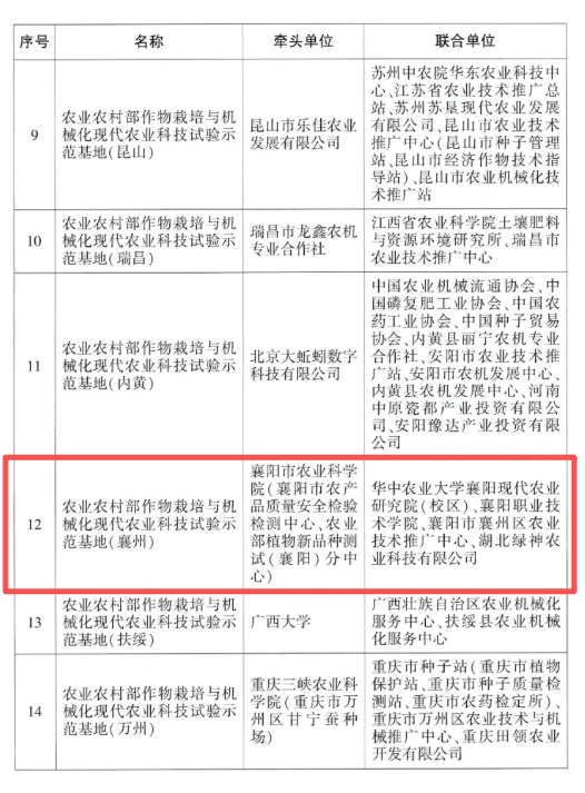 湖北日报讯(记者张源、通讯员周理高)近日,第一批农业农村部现代农业科技试验示范基地名单公布,襄阳市农科院等单位牵头建设的农业农村部作物栽培与机械化现代农业科技试验示范基地(襄州)成功入围。
