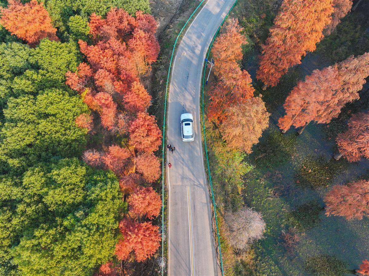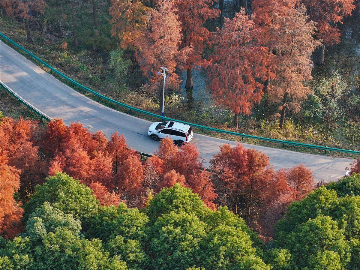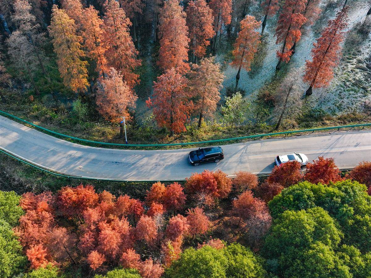 午后,阳光穿透枝丫,为挺拔的水杉林披上最华丽的盛装。从锈红、绛红到橙黄,色彩层次分明,宛如大自然打翻的调色盘,与周边常绿植被形成鲜明对比,构成一幅绚丽的油画。林间公路上,车辆穿梭,游客或缓行欣赏,或驻足拍照,人车仿佛都成了这幅巨幅画卷中的灵动笔触。