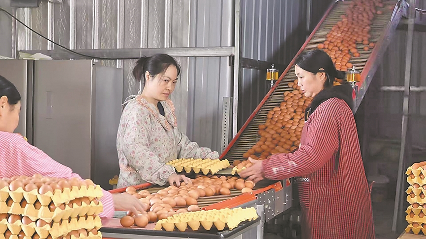 12月3日,在襄州区峪山镇万垱村智慧鸡舍,自动喂料、恒温控制、智能清粪等系统有序运转,4万余只蛋鸡在科学管理中健康生长,日均产蛋量4万余枚。同时,智慧鸡舍还配备了自动化设备,实现鲜蛋快速分拣、装盒。(来源:襄阳日报 李旭 摄)